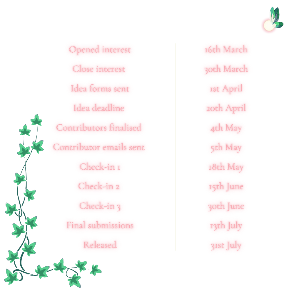 This is a provisional schedule and may be subject to change. Individual dates can also be extended for personal circumstances.