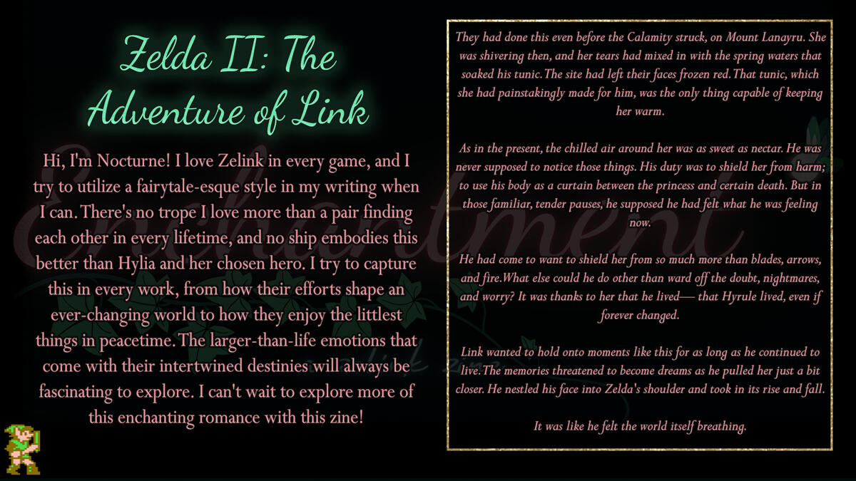 In this zine, we will be exploring the magical ties that link our favourite blond elves, Princess Zelda and the Hero, Link. Throughout the series, they have found themselves transformed into wolves and dragons, interacted with fairies and light spirits, flown on loftwings and flying whales, and even become ghosts and other species. Magic has always played an integral part in The Legend of Zelda and this zine gives artists and writers the opportunity to explore that theme.Any type of magic goes! Supernatural creatures, traditional witches and wizards, anything you can imagine.The only rule is that it must be canon or AU. No original legends or LU, sorry!